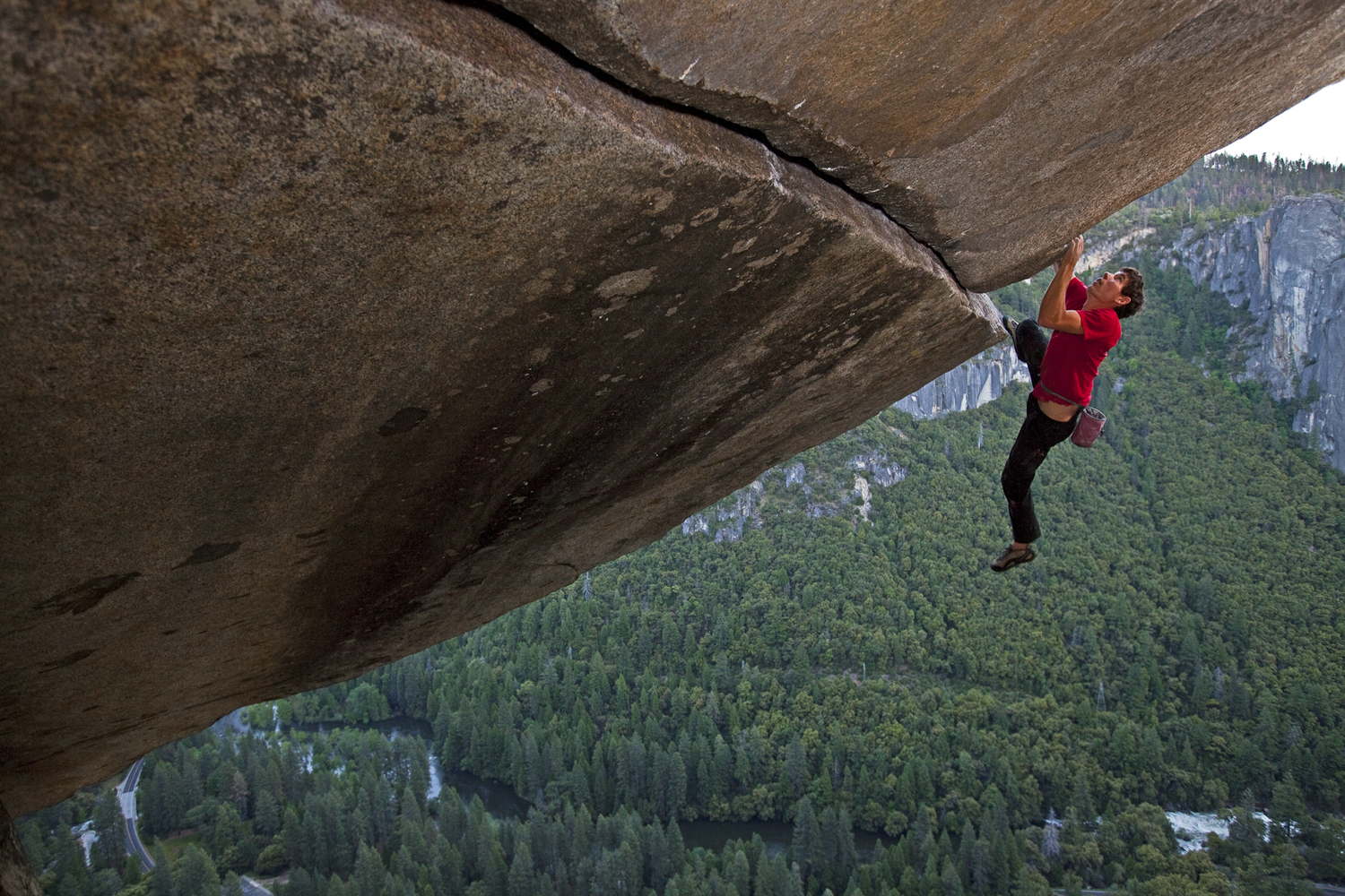fs1 Next → Alex Honnold making a rope-less ascent of the famous Seperate Reality, a difficult over hanging hand rack that is perched 500ft. above the Valley floor. This route has only been done rope-less three other times.