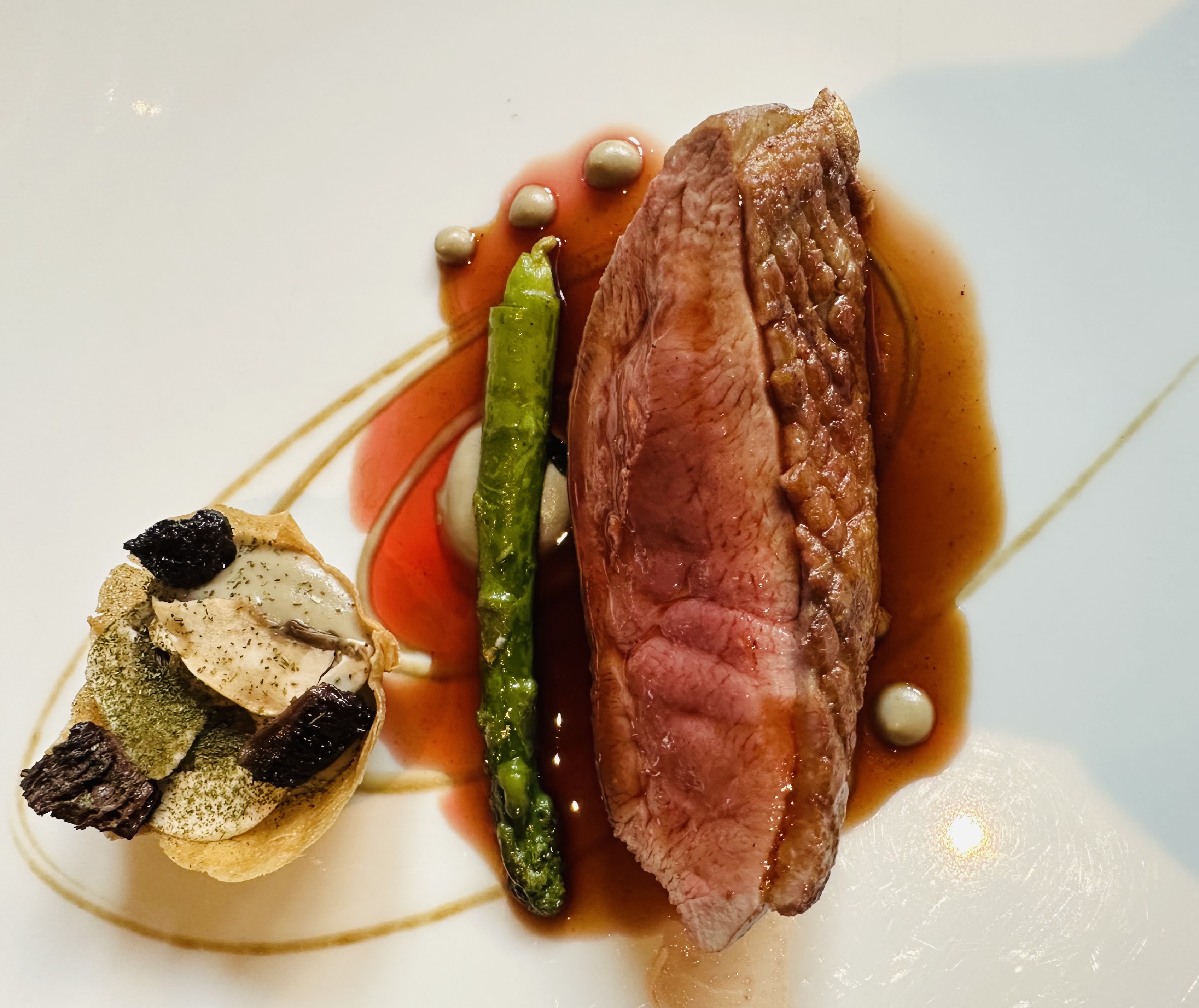 The main course is roast Perthshire duck breast, served with a morell mushroom tart and asparagus. Again, this is a revelation: I’m not usually keen on duck, but this is delicious – and that mushroom tart is bursting with flavour.