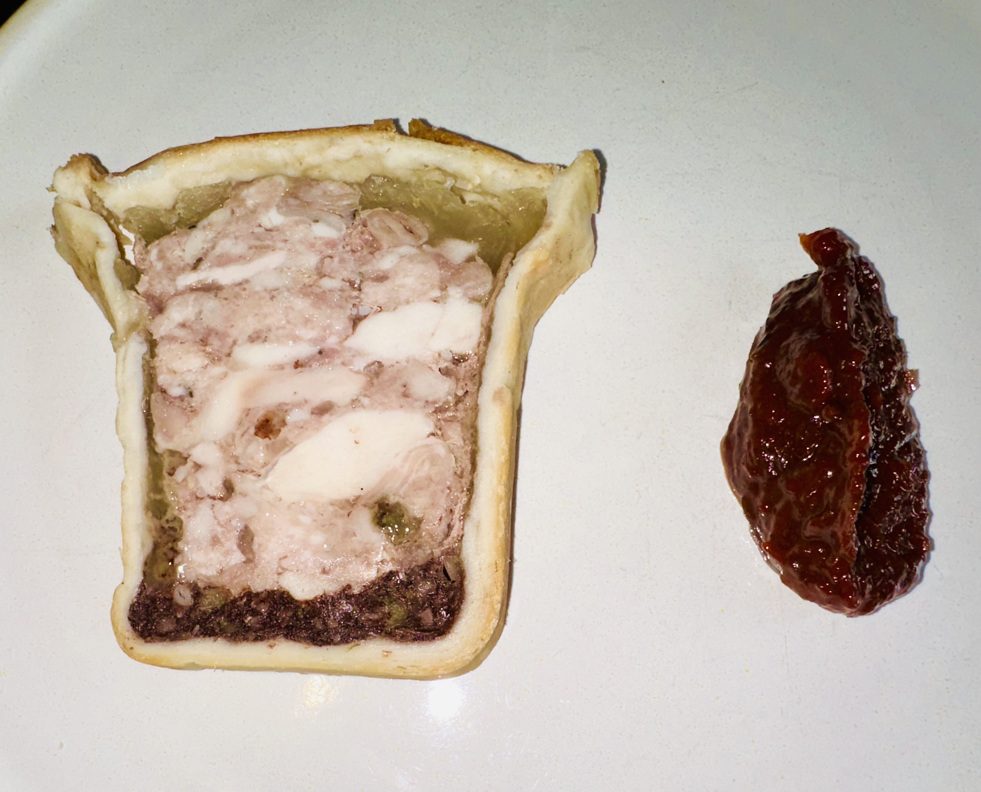 Next up, it’s rabbit paté en croute, a pastry frame containing layers of black pudding and spiced apple chutney as well as the meat. I’m not sure I’m going to like this; I haven’t eaten rabbit very often and I remember it as very strong and gamey. But this incarnation is delicate and light, and the gooseberry chutney on the side is a joy.