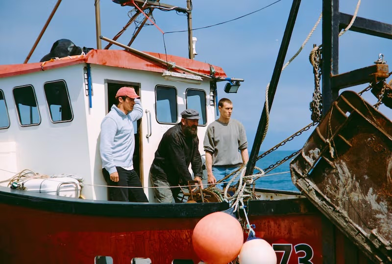 Everything falls eerily into place. The Captain’s slot is filled in minutes when the mysterious ‘Murgey’ (Francis McGee) turns up asking if his services will be needed. Homeless drifter Liam (Callum Turner) is glad of anything that will earn him a few quid and keep him occupied for a while. And married man, Nick (George MacKay), needs to raise some cash in order to fix a hole in the roof of his house through which the rain is pouring, though he’s reluctant to leave his wife and little girl behind.